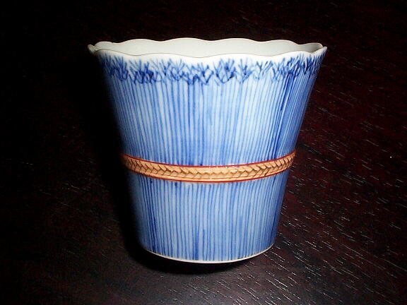 藍柿右衛門の猪口(本来は向付か?)の中でも大変珍しいものです。 延宝から元禄頃のものです。芝垣がとても丁寧に繊細に描かれています。 縄文部分は盛り上がっていて、細く赤い線で縁取られ、縄の上には細かく金彩で模様が描かれ、 とても凝って洒落たデザインです。器形とのバランスも絶妙で、見事な出来栄えです。 状態は極めて良く完品です。