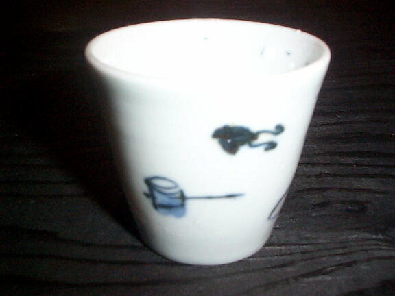 幕末頃ののぞき猪口です。 鋏、切花、花活け用の籠、水汲み用の柄杓が描かれた大変珍しい文様、珍品です。 小ぶりながら、とても存在感があります。 高台に極小のホツがありますが気になるものではありません。
