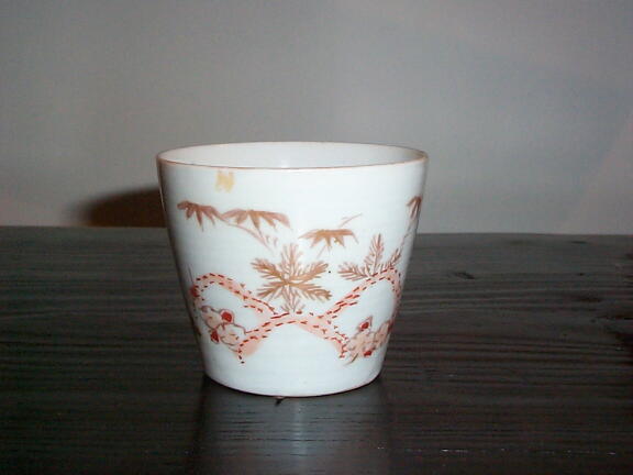 江戸後期。色絵&金彩でさわやかに絵付けがされています。染付が施されていない猪口は珍しいものです。高台縁に極小のホツがあります。また、側面に1箇所釉薬がはげた部分がありますが、いずれも気にならない程度のものです。