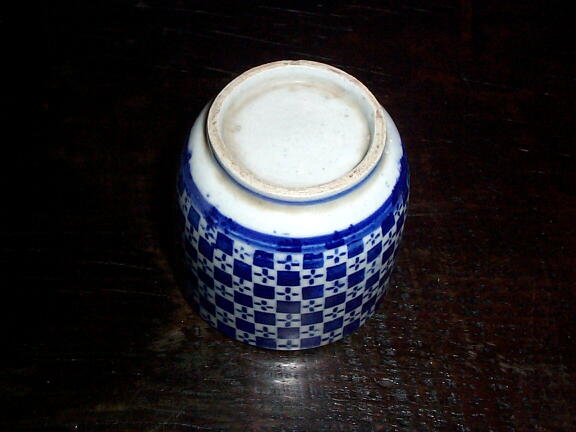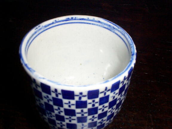 明治の印判猪口。ベロ藍の市松文がモダンな雰囲気です。口縁に小さな地貫入(窯瑕)がありますが気にならない程度だとおもいます。