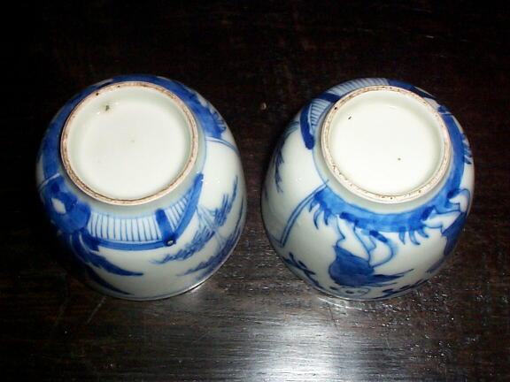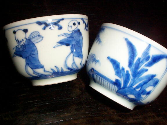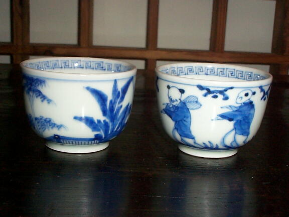 幕末〜明治頃、産地はおそらく瀬戸だとおもいます。 軽やかに踊る唐子の表情が柔らかで、和やかな雰囲気です。 ぐい呑みに丁度良い大きさですが、中国茶を飲んでもいいとおもいます。 1客の口縁にわずかに釉薬がかかっていない所がありますが、2客ともに問題にするような瑕はありません。 2客揃いで御願いいたします。
