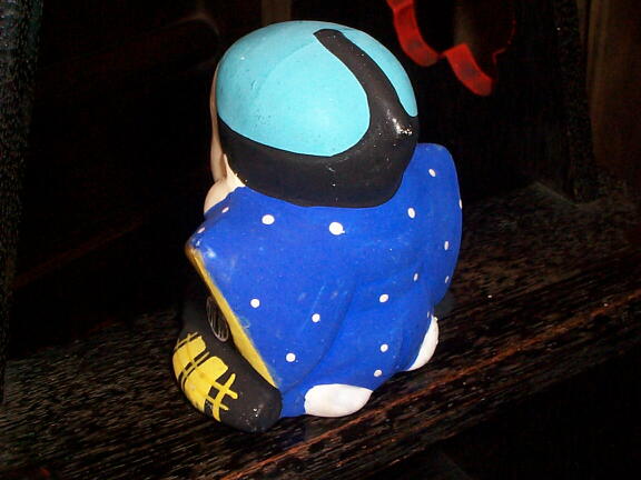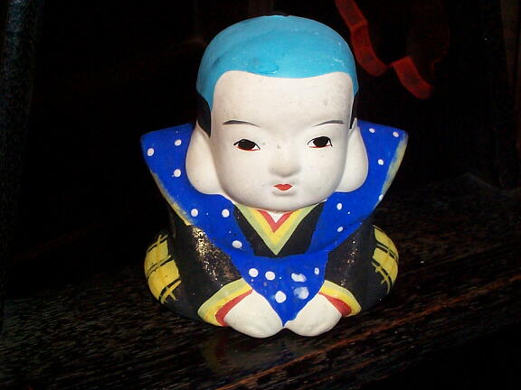 若干、色の剥げた箇所や目立たぬ汚れがありますが、発色も良く状態は良好です。 福助人形は一体ごとに表情が異なりますが、この福助は両目の感覚が離れていて 妙に落ち着いたような表情をしていますが、そこに面白みが感じられると思います。 昭和初期頃のものだと思われます。