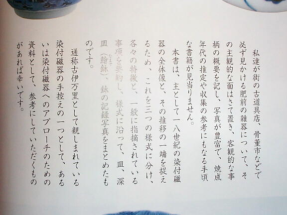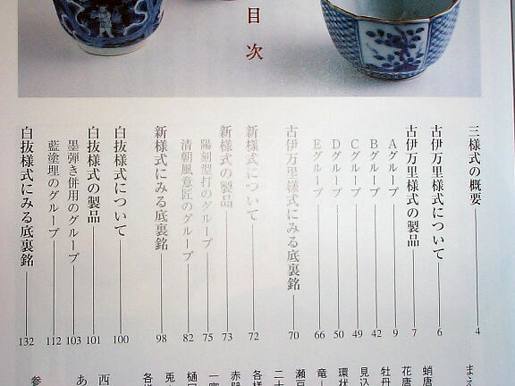 写真が豊富で焼成年代の推定や収集の参考にもなる古伊万里染付のハンドブックとして2000年6月刊行されました。多くの人に愛好されながら、それゆえに雑器として軽視されがちな一八世紀の古伊万里染付に、初めて体系的なアプローチを試みたものです。655点の器皿(皿、なます鉢、鉢)を「古伊万里様式」「新様式」「白抜様式」の三様式に区分し、各々の意匠と裏銘、技法の特徴等を客観的に検証しながら、その製生年代までも明らかにします。多彩な文様と確かな技法で幅広く親しまれ、愛されている古伊万里染付の、いまだ知られざる側面に迫る資料として、座右に置きたい図録です。
