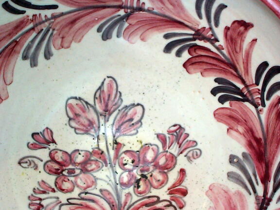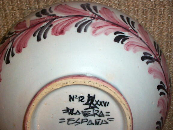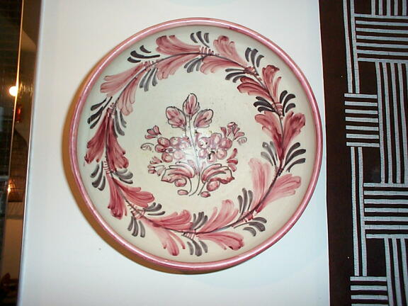 スペイン製の素焼きの飾り鉢。高台に穴が空いていて、壁にかけられるようになっています。 年代不詳。それ程古いものではないと思いますが、素朴な味わいで存在感があります。 見込みに降り物(小さな黒点)がありますが、問題にするような瑕はありません。