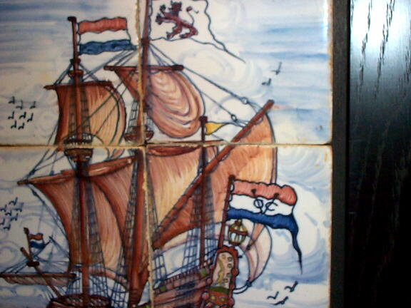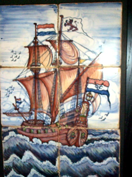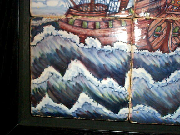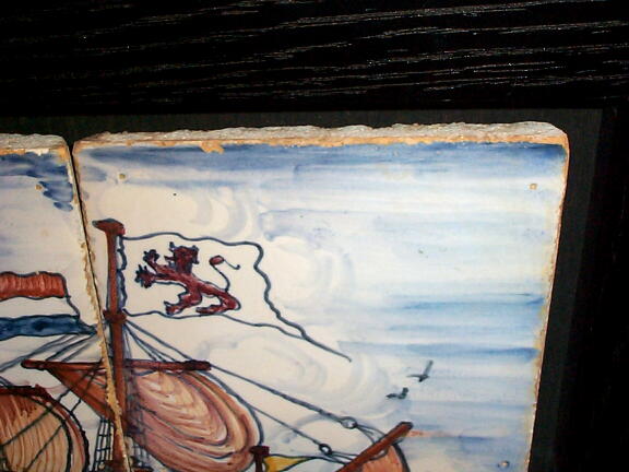 オランダのデルフト焼きのタイル。 東インド会社の内装に使われていたものです。 時代は東インド会社が羽振りの良かった1700年前後の頃のものと推定されます。 VOCと描かれた旗が勢い良くはためき、大きく風をはらんだ帆、荒々しい波々が力強く描かれています。 海洋画は専門家が描かないと、波頭の向き、帆、旗の風の受け方、船体の向きなどが実際と異なり、白々しい画になってしまうそうですが、この画は臨場感あふれる堂々としたもので、海洋画としても大変素晴らしい出来栄えです。 アンティークとしても、画としても価値の高いものです。 状態は極めて良好で、問題にするような瑕はありません。 黒い木枠で額装してあり、もちろん壁に掛けられるようになっています。 タイル1枚は12.5cm四方形。 額縁を入れた大きさは44cm×57cm、額縁の厚さは2cmです。