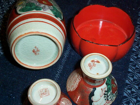 古い九谷焼の酒器セットです。 杯の大きさが異なるので、夫婦用だとおもいます。 時代は大正前後頃。 写真の塗りの袴をおまけにつけます。 問題にするような傷はありません。