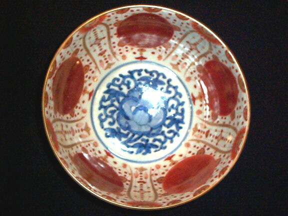 江戸後期、赤玉瓔珞文の鉢です。写真の見込みや高台に白く光っている部分がありますが、実物は美しい染付です。 染付と色絵のバランスが絶妙で大変美しい仕上がりです。