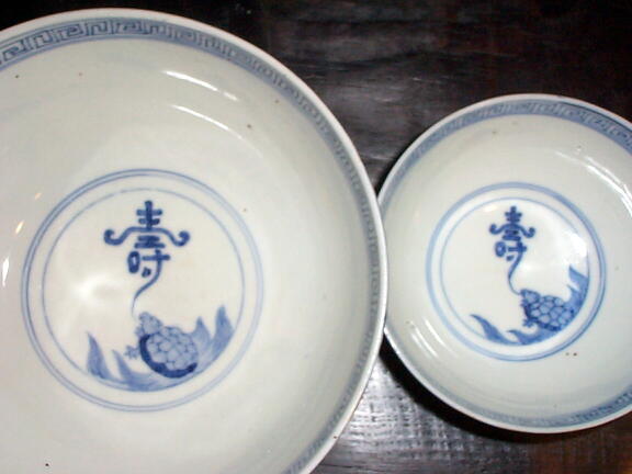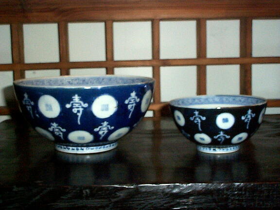 明治時代。元々は三ツ重鉢だった物とおもわれますが、(中)に相当する鉢がありません。外側に白抜きの壽と福の丸紋、見込みには壽の字を口から吐き出す亀が描かれています。にきび(黄鉄鉱の成分)と側面に小さな窯瑕(釉薬がかかっています)がありますが、気にならない程度です。(大)はラーメン丼に最適です。(これが意外と見つからないのですよね・・・)(小)は少し大ぶりのご飯茶碗といった感じです。古い器でラーメン&ライスをいただくのも、なかなか粋だとおもいますが、いかがでしょうか?