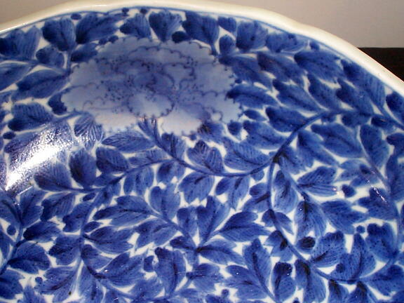 江戸中期、宝暦よりも少し前、1740年代頃の作品です。 全体にぎっしりと丁寧に牡丹文が描かれていて、大変見事な鉢です。 当時は葉脈にそって金彩が施されていたようで、わずかに名残があります。また、 細かい使用痕があります。 高台内側に小さなホツがありますが、気にならないものです。