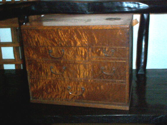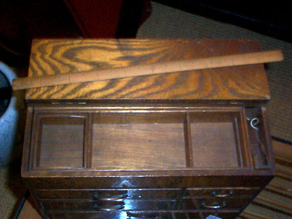 小物整理に便利で人気の古い針箱です。数ある針箱の中でもしっかりとした丁寧な造りで、桑の木目も美しく上品で、金具も良いものをつかっています。珍しく、オリジナルの物差しも付いています。残念ながら写真の左下に欠損部分がありますが使用上は差し支えありません。また、古いものなので小さなキズや汚れがありますが気になるほどではありません。