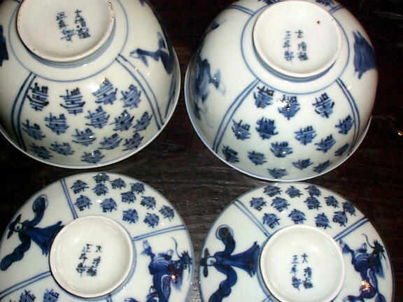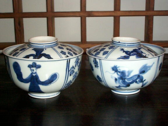 NO.10013 伊万里染付 人物麒麟壽文飯茶碗(2客)