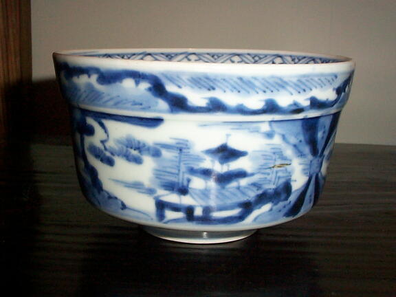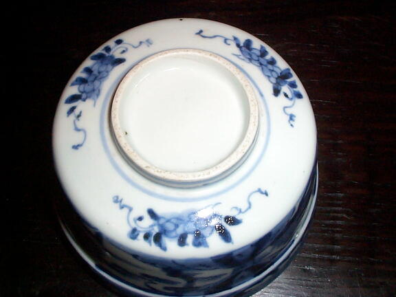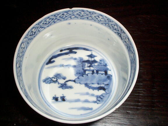江戸後期。器全体に染付がしっかりと描かれています。残念ながら口縁に5mm程度のホツがありますので、お安く提供いたします。