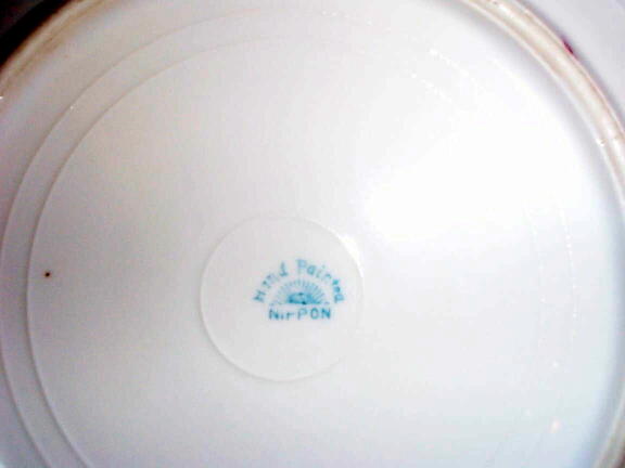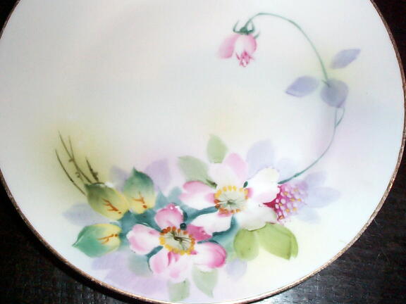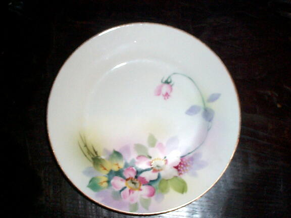 ドッグフラワー模様(苺?の花と実の模様)のパン皿です。口縁金彩はかなり薄れてしまっていますのでご了承ください。裏スタンプは日の出印NIPPON、1916年頃のものです。
