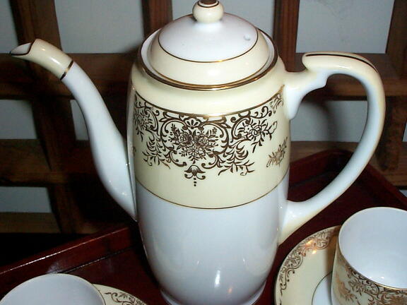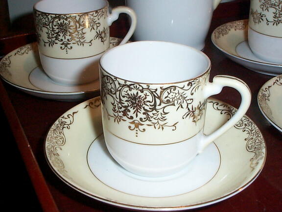 デミタス4客とコーヒーポットの単位でミニマムセットとして作られたものです。 金彩の薄れもなく状態は極めて良好です。 1918年以降のレッドマーク。