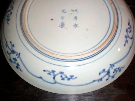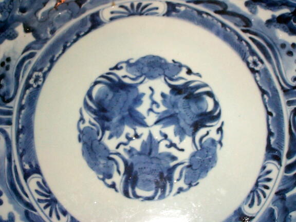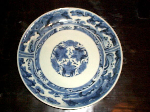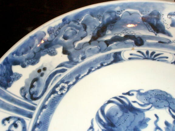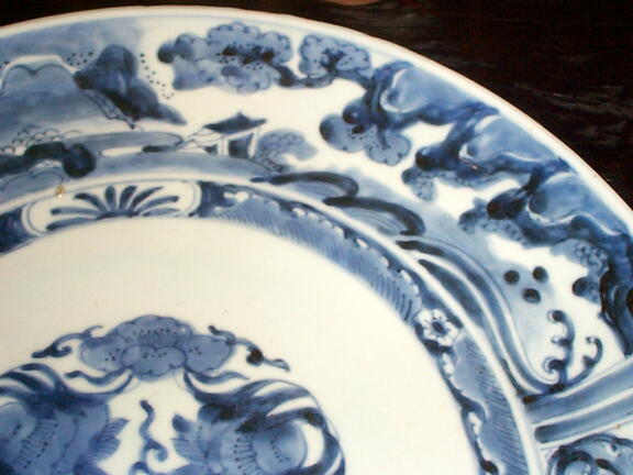 江戸中期、風格を感じさせる上手の尺皿です。呉須の濃淡で、楼閣、松、波、雲、山が力強く描かれています。見込みの小さな降り物はほとんど気にならない程度で、完品といって良いでしょう。オレンジ色の部分は光線が写りこんでいるものです。