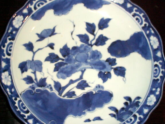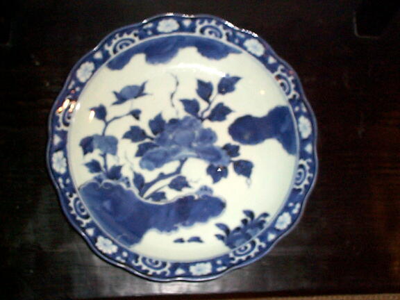 NO.50006 伊万里染付 牡丹岩文輪花尺皿(1客)