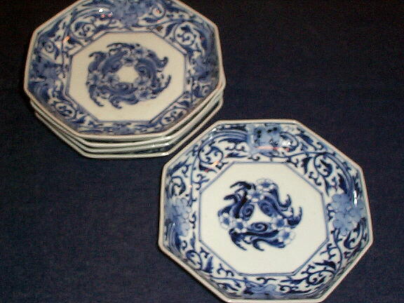 NO.30056 伊万里染付 藍柿右衛門 桜蝶文八角皿(5客)