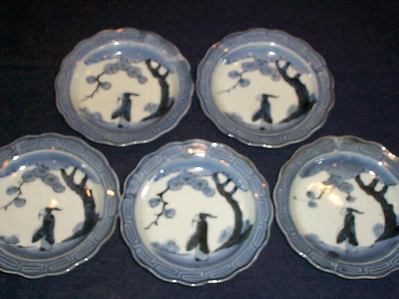 NO.30057 伊万里染付 樹下人物文輪花皿(5客)