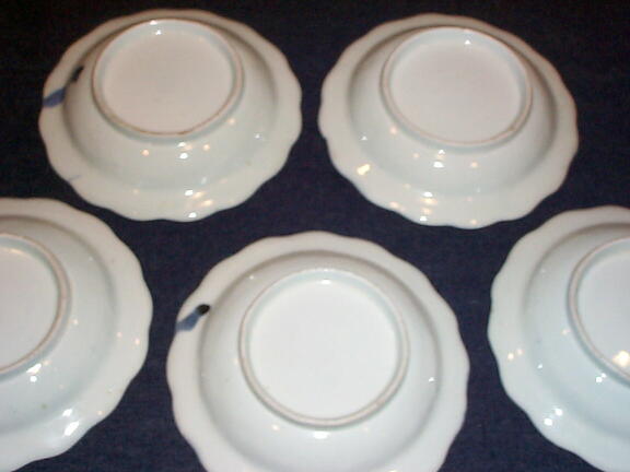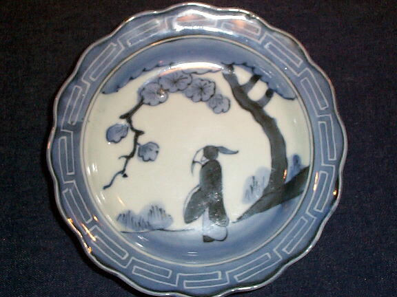樹下に人物(文人?)は中国の故事に由来している絵柄です。 口縁は墨弾きの技法を用いています。口縁の藍に若干のムラがあり、 写真の通り、裏面に大きくはみ出ているものもあります。 2枚に小さな降り物(にきび、ひっつき)があります。 いずれも問題にする程ではありません。