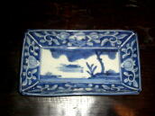 NO.30030 伊万里染付 唐草窓絵風景文長角皿(1客) \16,000 ※送料当店負担 窯キズあり 江戸後期、長さ21.2cm、幅11.8cm、高さ4cm |